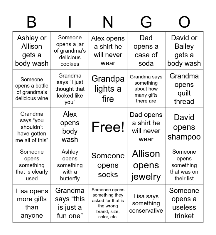 This bingo card has a free space and 24 words: Ashley opens something with a butterfly, Grandma says “this is just a fun one”, Grandpa lights a fire, Lisa opens more gifts than anyone, David or Bailey gets a body wash, Ashley or Allison gets a body wash, Someone opens a bottle of grandma’s delicious wine, Someone opens a jar of grandma’s delicious cookies, Dad opens a shirt he will never wear, Someone opens socks, Grandma says something about how many gifts there are, Grandma says “you shouldn’t have gotten me all of this”, Allison opens jewelry, Someone opens something that was on their list, Grandma says “I just thought that looked like you”, Lisa says something conservative, David opens shampoo, Alex opens a shirt he will never wear, Grandma opens quilt thread, Alex opens body wash, Someone opens a useless trinket, Someone opens something that is clearly used, Dad opens a case of soda and Someone opens something they asked for that is the wrong brand, size, color, etc..