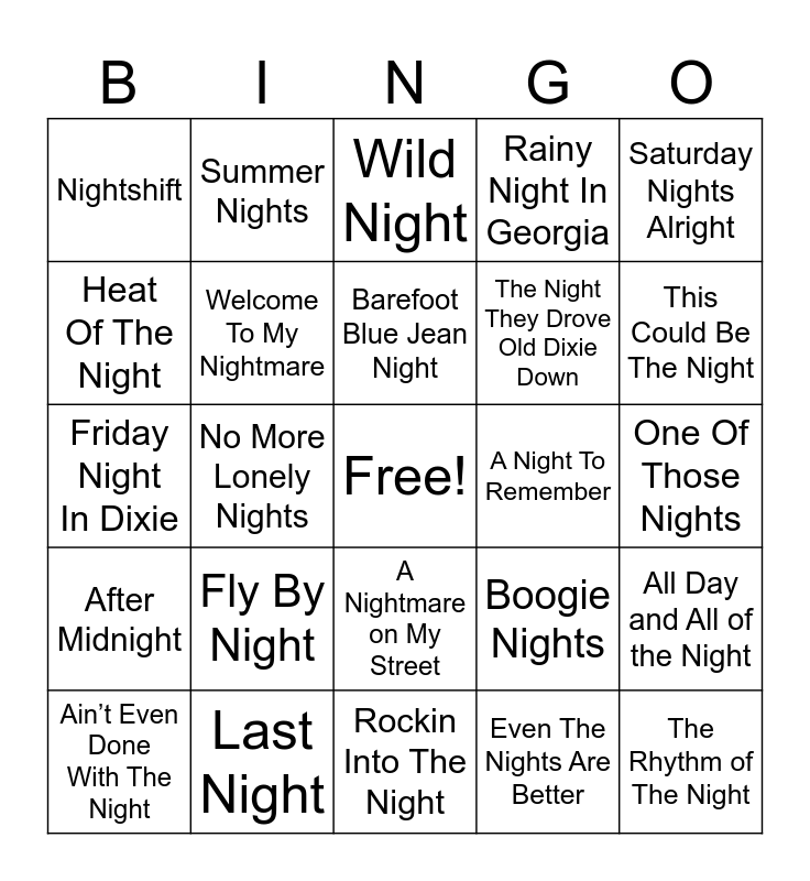 This bingo card has a free space and 59 words: The Night, Last Night, You Shook Me All Night Long, After Midnight, Even The Nights Are Better, (There’s A) Fire in the Night, Welcome To My Nightmare, I Love The Nightlife, The Night They Drove Old Dixie Down, Lonely Is The Night, Rainy Night In Georgia, All Night, Heat Of The Night, Stay The Night, Night On The Country, Nightshift, The Rhythm of The Night, Saturday Nights Alright, Nightrain, Barefoot Blue Jean Night, A Night To Remember, Wild Night, Ain’t Even Done With The Night, All Day and All of the Night, Ladies Night, American Nights, All Night Long, Night Train (Smooth Alligator), This Could Be The Night, That’s My Kind Of Night, I Don’t Want This Night To End, Nights In White Satin, One Night In Bangkok, Southern Nights, Summer Nights, Shadows Of The Night, Because The Night, No More Lonely Nights, Another Night, Friday Night In Dixie, Let’s Spend The Night Together, Fly By Night, One Of Those Nights, On A Night Like This, Sunglasses at Night, Dark Night, Queen Of The Night, Freaks Come Out At Night, A Nightmare on My Street, Rockin Into The Night, Saturday Night, Straight Tequila Night, Small Town Saturday Night, Big City Nights, Endless Summer Nights, Boogie Nights, I Love A Rainy Night, Last Friday Night and All My Rowdy Friends Are Coming Over Tonight.