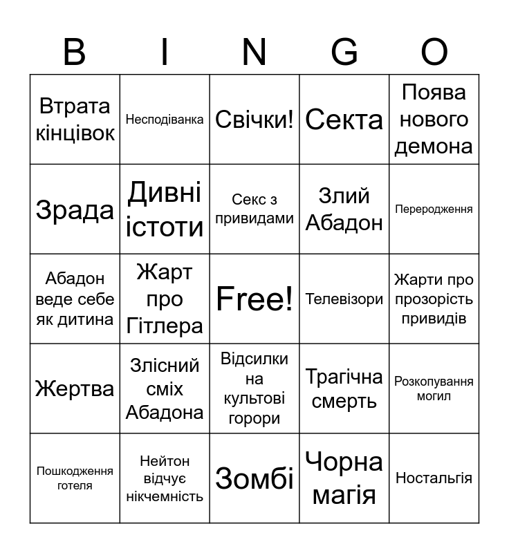 This bingo card has a free space and 24 words: Злісний сміх Абадона, Нейтон відчує нікчемність, Секс з привидами, Пошкодження готеля, Поява нового демона, Втрата кінцівок, Зрада, Несподіванка, Телевізори, Відсилки на культові горори, Злий Абадон, Абадон веде себе як дитина, Трагічна смерть, Розкопування могил, Дивні істоти, Чорна магія, Жарти про прозорість привидів, Свічки!, Переродження, Жарт про Гітлера, Ностальгія, Жертва, Секта and Зомбі.