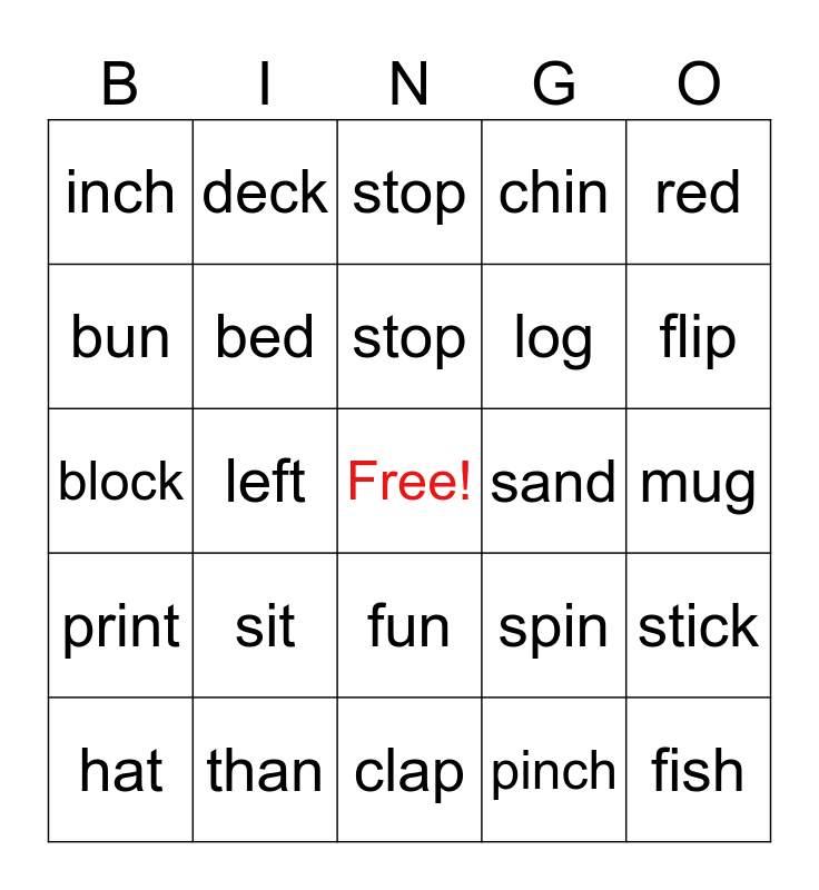 This bingo card has a free space and 29 words: hat, can, left, dog, inch, stop, bed, sit, sand, than, mug, fish, clap, pinch, flip, top, fun, print, red, block, spin, pan, log, bun, chin, deck, stick, stop and pack.