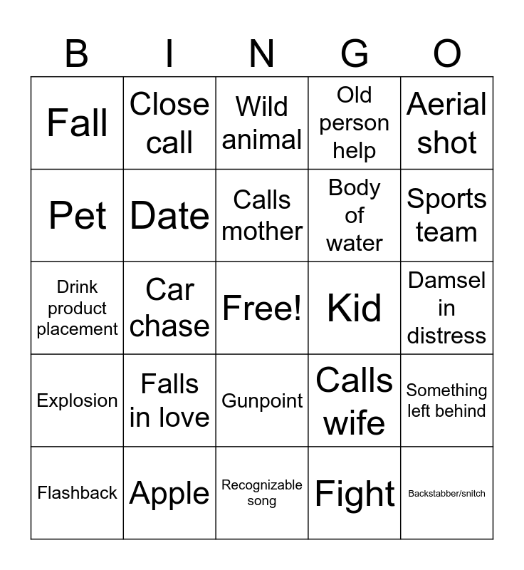 This bingo card has a free space and 24 words: Falls in love, Apple, Calls mother, Flashback, Aerial shot, Fall, Pet, Close call, Kid, Gunpoint, Body of water, Drink product placement, Calls wife, Something left behind, Date, Fight, Damsel in distress, Wild animal, Sports team, Car chase, Backstabber/snitch, Explosion, Old person help and Recognizable song.