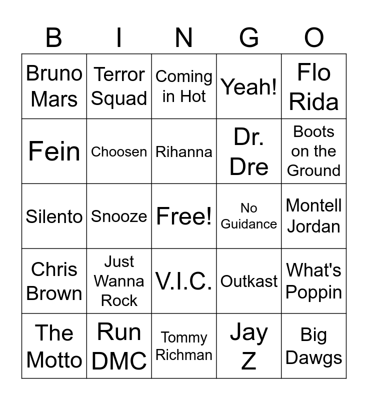 This bingo card has a free space and 24 words: Just Wanna Rock, Run DMC, Rihanna, The Motto, Flo Rida, Bruno Mars, Fein, Terror Squad, No Guidance, V.I.C., Dr. Dre, Silento, Outkast, What's Poppin, Choosen, Jay Z, Montell Jordan, Coming in Hot, Boots on the Ground, Snooze, Big Dawgs, Chris Brown, Yeah! and Tommy Richman.