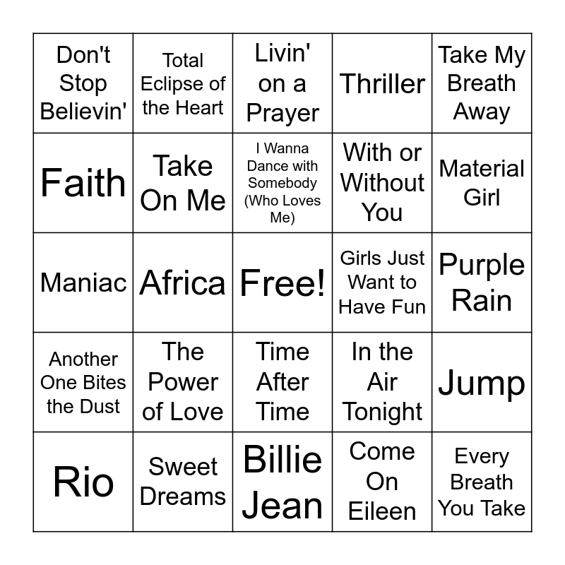 This bingo card has a free space and 30 words: Sweet Dreams, Jessie's Girl, Africa, Footloose, Don't Stop Believin', Livin' on a Prayer, Take On Me, Time After Time, Girls Just Want to Have Fun, Billie Jean, Purple Rain, Every Breath You Take, Come On Eileen, You Spin Me Round, Material Girl, Karma Chameleon, In the Air Tonight, Another One Bites the Dust, The Power of Love, Take My Breath Away, Maniac, Walk Like an Egyptian, Total Eclipse of the Heart, With or Without You, Faith, Thriller, Jump, Rio, I Wanna Dance with Somebody (Who Loves Me) and You Drop the Bomb on Me.