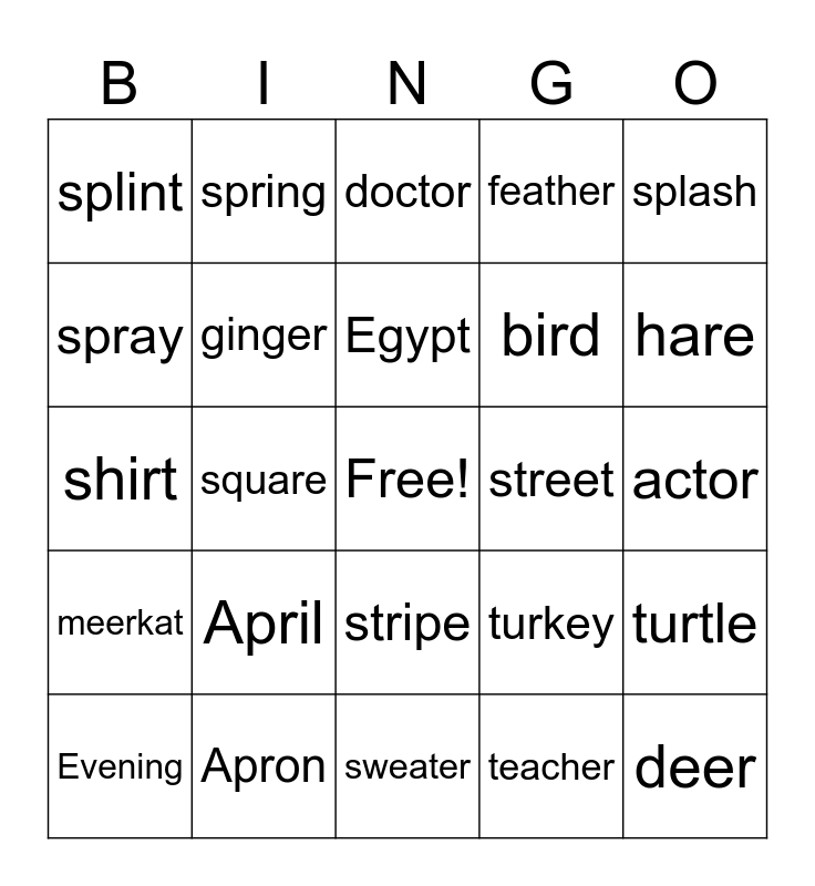 This bingo card has a free space and 24 words: April, Apron, Egypt, Evening, splash, splint, spray, spring, street, stripe, bird, shirt, turkey, turtle, ginger, teacher, actor, doctor, hare, square, deer, meerkat, feather and sweater.