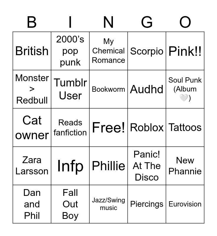 This bingo card has a free space and 24 words: Infp, Fall Out Boy, Bookworm, Dan and Phil, Pink!!, British, Monster > Redbull, 2000’s pop punk, Roblox, Phillie, Audhd, Cat owner, Panic! At The Disco, New Phannie, Tumblr User, Piercings, Tattoos, My Chemical Romance, Soul Punk (Album 🤍), Reads fanfiction, Eurovision, Zara Larsson, Scorpio and Jazz/Swing music.