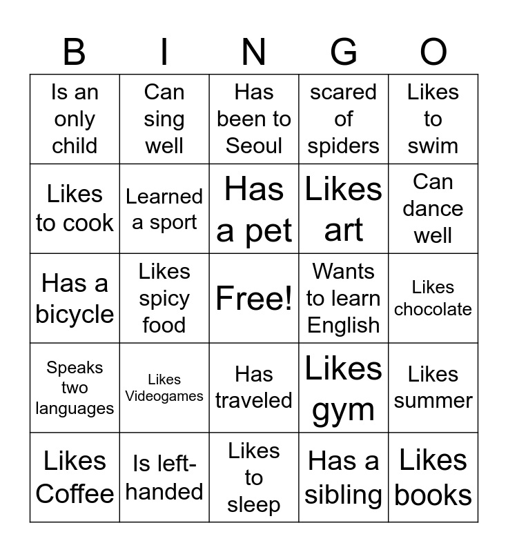 This bingo card has a free space and 24 words: Likes Coffee, Likes Videogames, Has a pet, Has a sibling, Likes to swim, Is an only child, Can sing well, Has been to Seoul, Wants to learn English, Likes chocolate, Has a bicycle, Learned a sport, Likes gym, Likes summer, Likes to cook, Is left-handed, Likes to sleep, scared of spiders, Can dance well, Speaks two languages, Likes spicy food, Has traveled, Likes art and Likes books.