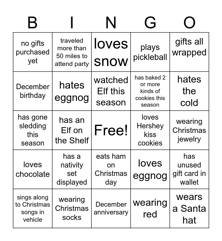 This bingo card has a free space and 24 words: has a nativity set displayed, wearing Christmas socks, watched Elf this season, sings along to Christmas songs in vehicle, gifts all wrapped, no gifts purchased yet, December birthday, traveled more than 50 miles to attend party, loves Hershey kiss cookies, eats ham on Christmas day, has baked 2 or more kinds of cookies this season, has gone sledding this season, loves eggnog, has unused gift card in wallet, hates eggnog, wearing red, wearing Christmas jewelry, loves snow, hates the cold, has an Elf on the Shelf, wears a Santa hat, loves chocolate, plays pickleball and December anniversary.