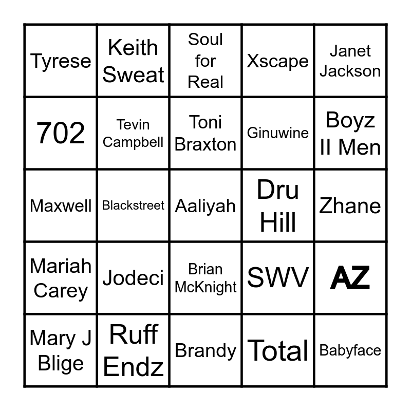 This bingo card has 50 words: Case, Aaliyah, Kci & Jojo, Brandy, Jodeci, Adina Howard, Keith Sweat, Joe, 702, Groove Theory, Tevin Campbell, Xscape, AZ, SWV, TLC, Usher, Toni Braxton, Dru Hill, Foxy Brown, Janet Jackson, Blackstreet, Total, Tyrese, Ginuwine, D'Angelo, Babyface, Boyz II Men, Bell Biv Devoe, Soul for Real, Brian McKnight, Brownstone, Changing Faces, Color Me Badd, Lucy Pearl, Ruff Endz, En Vogue, Faith Evans, Bobby Brown, Monica, Zhane, H-Town, Donnell Jones, Jade, Michael Jackson, Mary J Blige, Maxwell, Johnny Gill, Shanice, Mariah Carey and Silk.