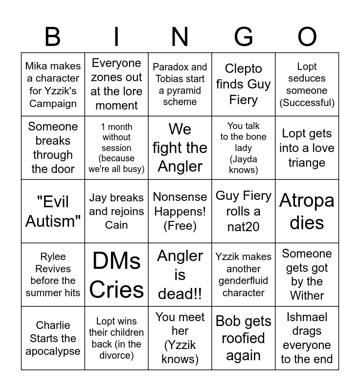 This bingo card has a free space and 39 words: Caine by end of the year, Kaber dies again, 1 month without session (because we all forgot), 1 month without session (because we're all busy), Charlie Starts the apocalypse, Angler is dead!!, We fight the Angler, Sage breaks Jayda's campaign, Lopt seduces someone (Successful), Rylee Revives before the summer hits, Jay breaks and rejoins Cain, Clepto finds Guy Fiery, Ishmael drags everyone to the end, Atropa dies, Guy Fiery rolls a nat20, DMs Cries, Selkie/Darril Die (So does Rylee), Mika makes a character for Yzzik's Campaign, Ishmael meets the mole, Yzzik makes another genderfluid character, Someone breaks through the door, You meet her (Yzzik knows), You talk to the bone lady (Jayda knows), Lopt gets into a love triange, Ishmael figures it out, Naryma gets access to Ourboros, Bob gets divorced (for real), Bob rips someone apart with his teeth, Jonny brings up baby shark, Everyone zones out at the lore moment, You meet Angela (Jayda knows), Paradox gets more god juice, Paradox and Tobias start a pyramid scheme, Lopt wins their children back (in the divorce), Bob gets roofied again, Charlie learn Kaber is not death, Someone gets got by the Wither, "Evil Autism" and Mission goes horribly wrong in every-way possible.