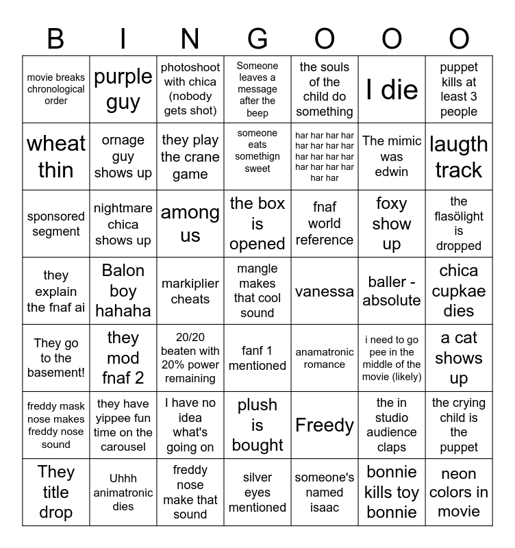 This bingo card has a free space and 48 words: Freedy, The mimic was edwin, silver eyes mentioned, Balon boy hahaha, among us, chica cupkae dies, purple guy, Uhhh animatronic dies, I die, fanf 1 mentioned, puppet kills at least 3 people, Someone leaves a message after the beep, foxy show up, fnaf world reference, freddy mask nose makes freddy nose sound, baller - absolute, wheat thin, laugth track, the in studio audience claps, the souls of the child do something, har har har har har har har har har har har har har har har har har har, markiplier cheats, movie breaks chronological order, ornage guy shows up, the crying child is the puppet, they play the crane game, the flasölight is dropped, They title drop, the box is opened, nightmare chica shows up, bonnie kills toy bonnie, vanessa, a cat shows up, they have yippee fun time on the carousel, they explain the fnaf ai, anamatronic romance, i need to go pee in the middle of the movie (likely), sponsored segment, 20/20 beaten with 20% power remaining, I have no idea what's going on, They go to the basement!, neon colors in movie, photoshoot with chica (nobody gets shot), freddy nose make that sound, someone eats somethign sweet, plush is bought, they mod fnaf 2 and someone's named isaac.