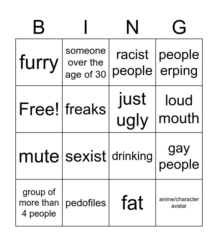 This bingo card has 16 words: pedofiles, gay people, racist people, furry, mute, someone over the age of 30, drinking, fat, Free!, freaks, group of more than 4 people, people erping, sexist, loud mouth, just ugly and anime/character avatar.
