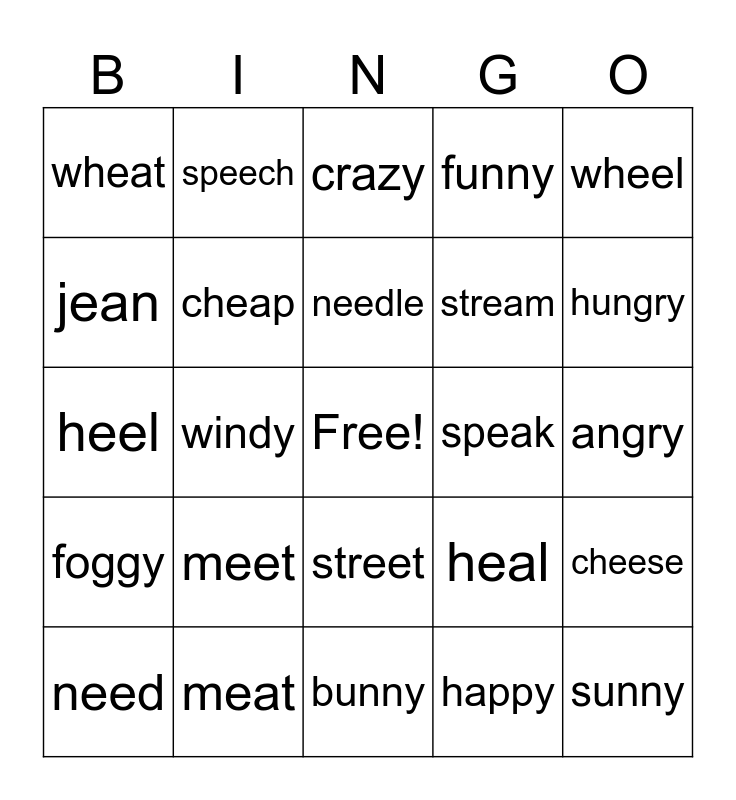 This bingo card has a free space and 24 words: meet, meat, needle, need, wheel, wheat, jean, speech, speak, street, stream, heel, heal, cheese, cheap, happy, angry, crazy, hungry, windy, sunny, foggy, funny and bunny.