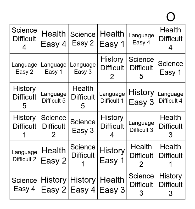 This bingo card has 36 words: History Easy 1, Science Difficult 1, Health Easy 3, Language Easy 2, History Difficult 1, Language Difficult 1, Language Easy 1, History Easy 4, Language Easy 4, Health Difficult 2, Science Easy 1, Health Easy 1, Health Difficult 1, Language Difficult 5, History Difficult 2, Science Difficult 4, Language Difficult 2, History Easy 3, History Difficult 5, Science Easy 2, Health Difficult 5, Science Difficult 2, History Difficult 4, Science Easy 3, Language Difficult 3, Health Easy 4, Science Difficult 5, History Easy 2, Language Easy 3, Health Difficult 4, History Difficult 3, Science Easy 4, Health Difficult 3, Language Difficult 4, Health Easy 2 and Science Difficult 3.