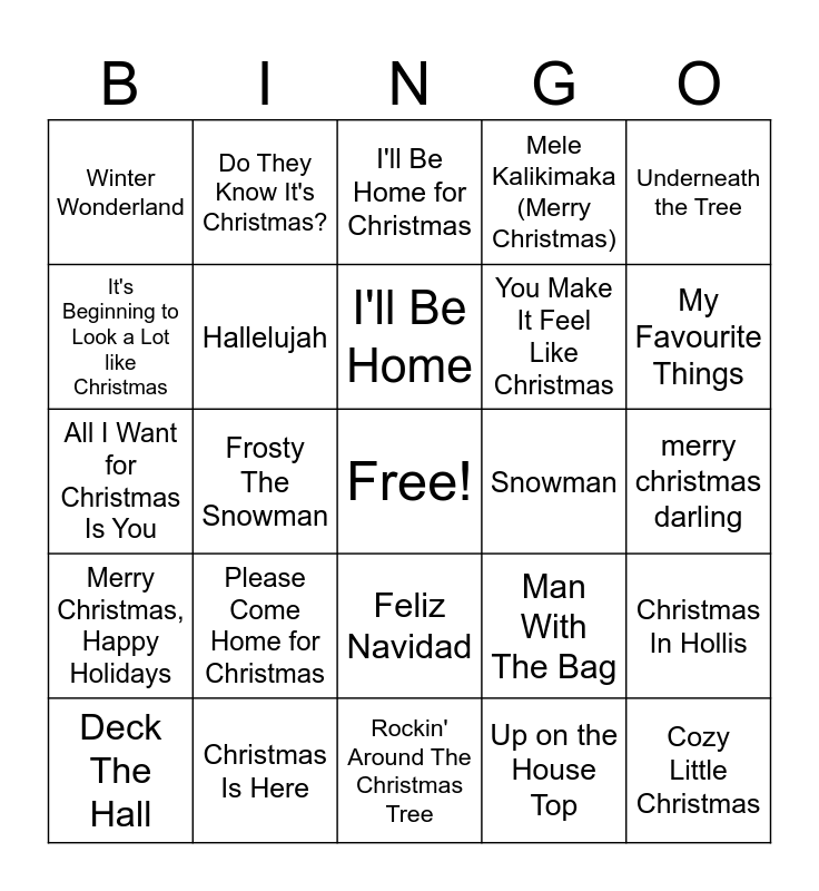 This bingo card has a free space and 81 words: Silent Night, Holy Night, Dance of the Sugar Plum Fairy, I'll Be Home for Christmas, Carol of the Bells, All I Want For Christmas (Is My Two Front Teeth), Have Yourself A Merry Little Christmas, White Christmas, Here Comes Santa Claus (Right Down Santa Claus Lane), The Christmas Song (Merry Christmas To You), Do You Hear What I Hear?, Blue Christmas, Let It Snow! Let It Snow! Let It Snow!, Mele Kalikimaka (Merry Christmas), Winter Wonderland, Rudolph The Red-Nosed Reindeer, It's Beginning to Look a Lot like Christmas, If Every Day Was Like Christmas, Please Come Home for Christmas, The First Noël, merry christmas darling, Baby, It's Cold Outside, Underneath the Tree, All I Want for Christmas Is You, I'll Be Home, Hallelujah, I Want a Hippopotamus for Christmas, Silver Bells, Christmas Lights, Thank God It's Christmas - 2011 Remaster, I Need You Christmas, My Favourite Things, You're A Mean One, Mr. Grinch, Rockin' Around The Christmas Tree, Holly Jolly Christmas, Deck The Hall, Snowman, This Christmas, Santa Claus Is Coming To Town, Christmas All Year Long, Little Saint Nick, Cozy Little Christmas, Christmas Without You, December 25th, It's the Most Wonderful Time of the Year, Frosty The Snowman, Last Christmas, Do They Know It's Christmas?, Christmas Tree Farm, Officially Christmas, We Wish You The Merriest, Man With The Bag, Christmas In Hollis, Cold December Night, The Chipmunk Song, Christmas, Back Home For Christmas, Gifts For Me, 8 Days of Christmas, Christmas Isn't Canceled, Hot Chocolate, Feliz Navidad, Mistletoe, Coming Home This Christmas, Where Are You Christmas?, What Christmas Means to Me, Sleigh Ride, You Deserve It All, I Saw Mommy Kissing Santa Claus, 1 Wish, Dear Santa, Merry Christmas, Merry Christmas, Happy Holidays, Christmas Is Here, December, Jingle Bell Rock - Daryl's Version, Santa, Can’t You Hear Me, Merry Christmas Everyone, Up on the House Top, Run Run Rudolph, You Make It Feel Like Christmas and Santa's Coming for Us.