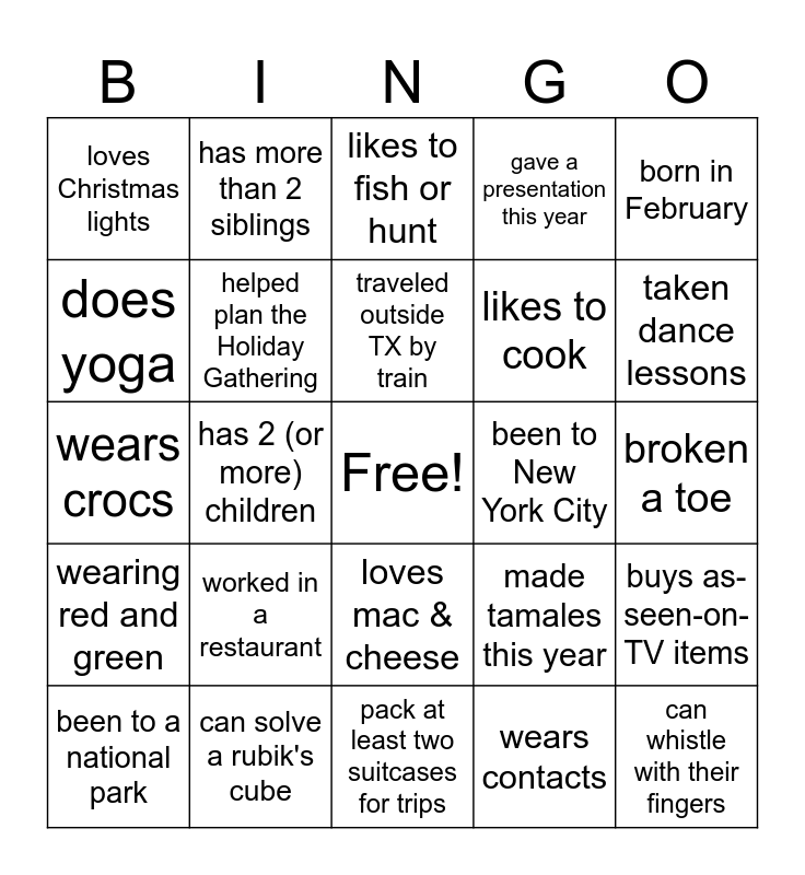 This bingo card has a free space and 64 words: born outside the U.S., plays video games, dressed up for Halloween this year, buys as-seen-on-TV items, has played pickleball, doesn't drink caffeine, has more than 2 siblings, been to Europe more than once, traveled outside TX by train, athlete in HS, loves mac & cheese, plays a stringed instrument, broken a toe, born in February, knows nato phonetic alphabet, does yoga, has 2 (or more) children, loves Christmas lights, been to 2 music concerts this year, likes to cook, worked in a restaurant, wearing red and green, gave a presentation this year, likes to swim, went to Pins & Wheels for after hours teambuilding, plays the lottery, shopped for gifts for foster children, cooked Thanksgiving turkey this year, left handed, has a dog, takes a walk every day, has a balcony, went to a movie this month, attended 4 meetings this week, taken dance lessons, been to a national park, doesn't like cantelope, wears contacts, listened to a podcast this month, helped plan the Holiday Gathering, wears crocs, been to New York City, wears toe socks, wearing black shoes, knows a foreign language, can whistle with their fingers, can solve a rubik's cube, loves karaoke, made tamales this year, decorated Christmas cookies this year, bought an ornament for the exchange, has more than 4 indoor houseplants, pack at least two suitcases for trips, only takes carryon luggage on trips, likes to go to the library, knows how to crochet or knit, likes to fish or hunt, has a gym membership, likes horror movies, has an out-of-state degree, has been with the state for 5 years or less, has 10 or more years of state service, is eligible for retirement and has a cat.