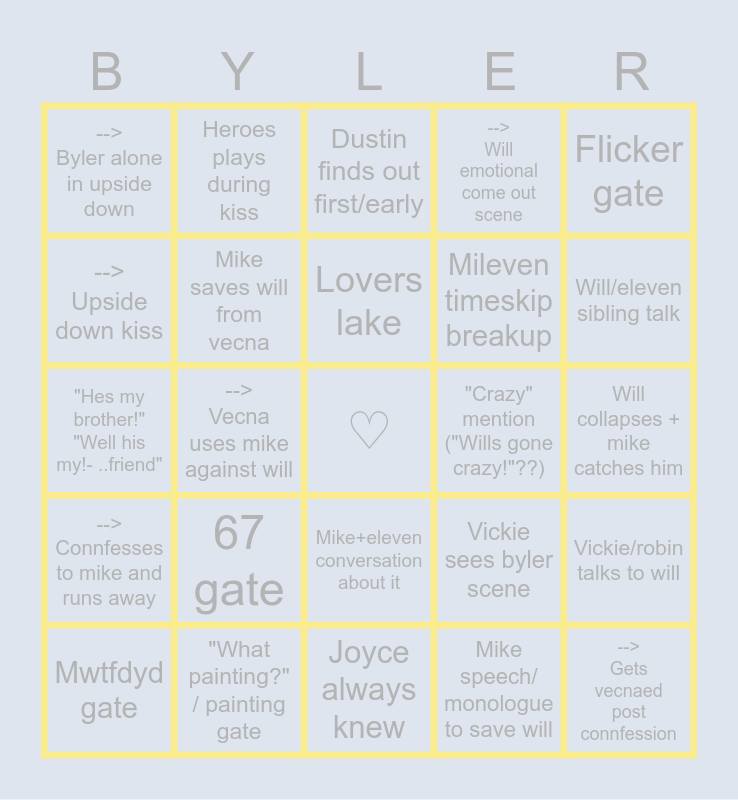 This bingo card has a free space and 24 words: 67 gate, "What painting?" / painting gate, Lovers lake, Mwtfdyd gate, Flicker gate, --> Byler alone in upside down, --> Upside down kiss, Heroes plays during kiss, "Crazy" mention ("Wills gone crazy!"??), Mike+eleven conversation about it, Mileven timeskip breakup, "Hes my brother!" "Well his my!- ..friend", Vickie sees byler scene, Vickie/robin talks to will, Mike saves will from vecna, Mike speech/ monologue to save will, Will collapses + mike catches him, Dustin finds out first/early, Will/eleven sibling talk, --> Vecna uses mike against will, --> Gets vecnaed post connfession, --> Connfesses to mike and runs away, --> Will emotional come out scene and Joyce always knew.