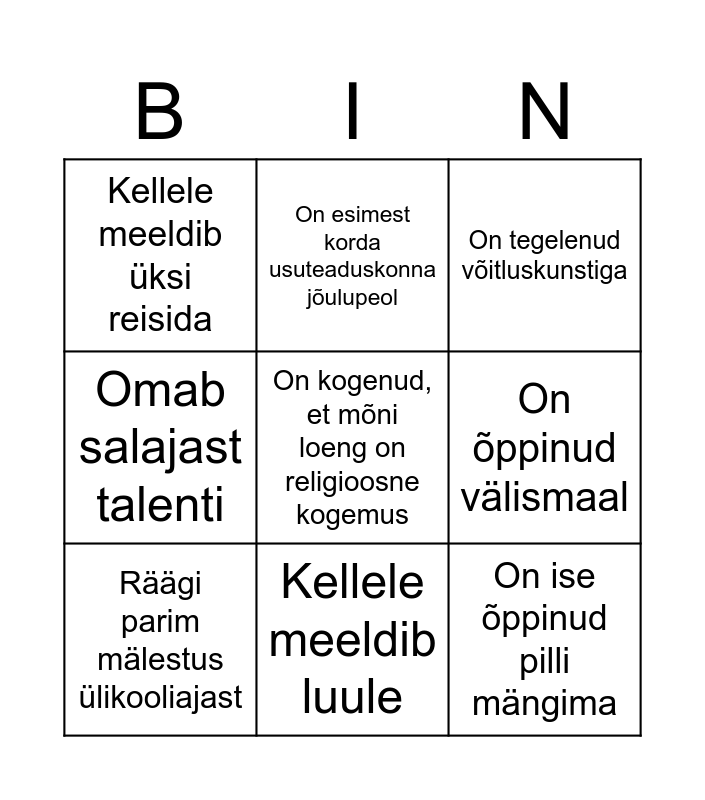 This bingo card has 24 words: Armastab eksootilist toitu, On pidanud seletama vanaemale, et teoloogia õppimine ei tähenda preestriks õppimist, Kellele meeldib luule, On läinud kogemata valesse loengusse ja selle lõpuni kuulanud, On kogenud, et mõni loeng on religioosne kogemus, Kellele meeldib üksi reisida, On õppinud välismaal, On esimest korda usuteaduskonna jõulupeol, On õppinud mõnda Aasia keelt, On usuteaduskonna vilistlane, On ise õppinud pilli mängima, On elanud teises riigis vähemalt kuu aega, Meeldib ilukirjandus, On õppinud mõnda piiblikeelt, Räägi parim mälestus ülikooliajast, Tegeleb erialaga, mida ei oleks osanud noorena ette näha, Kassiinimene, On tegelenud võitluskunstiga, Valis ülikooli eriala spontaanselt, Räägi parim mälestus sellest aastast, Sellel aastal midagi uut enda kohta õppinud, On kaitsnud magistritöö, Omab salajast talenti and Naudib õpetamist.