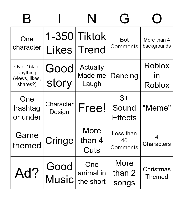 This bingo card has a free space and 24 words: Cringe, Good Music, Actually Made me Laugh, Ad?, More than 4 backgrounds, One character, Over 15k of anything (views, likes, shares?), 1-350 Likes, 3+ Sound Effects, More than 4 Cuts, Dancing, One hashtag or under, Less than 40 Comments, 4 Characters, Good story, More than 2 songs, "Meme", Tiktok Trend, Roblox in Roblox, Character Design, Christmas Themed, Game themed, Bot Comments and One animal in the short.