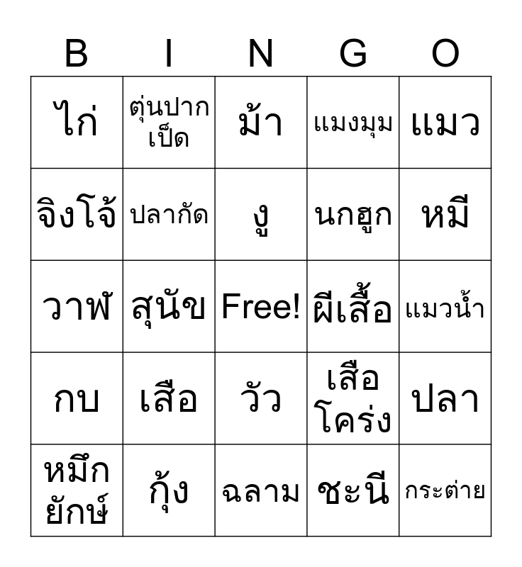 This bingo card has a free space and 42 words: นก, งู, สิงโต, เสือ, ชะนี, ปลา, กระต่าย, เต่า, ม้า, วัว, แมวน้ำ, หมี, สุนัข, แมว, ช้าง, เสือโคร่ง, ลิง, วาฬ, ค้างคาว, ตุ่นปากเป็ด, จิงโจ้, กระรอก, นกอินทรี, ไก่, เป็ด, นกเพนกวิน, นกฮูก, เต่า, จระเข้, งู, กิ้งก่า, กบ, ปลากัด, ฉลาม, ม้าน้ำ, หมึกยักษ์, กุ้ง, ผีเสื้อ, ผึ้ง, มด, แมงมุม and หิ่งห้อย.