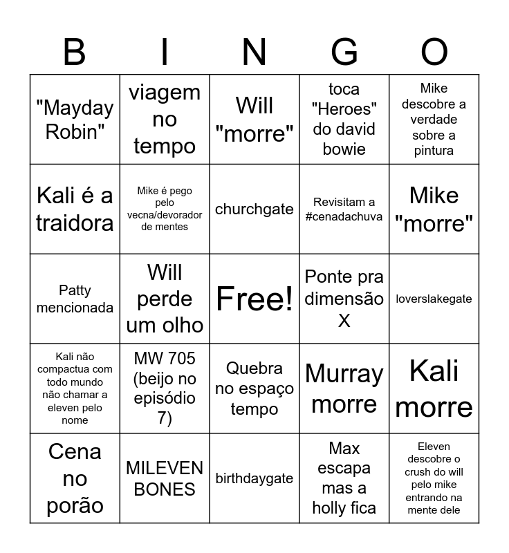 This bingo card has a free space and 25 words: MW 705 (beijo no episódio 7), birthdaygate, churchgate, Cena no porão, Mike descobre a verdade sobre a pintura, "Mayday Robin", Kali é a traidora, viagem no tempo, Ponte pra dimensão X, Quebra no espaço tempo, Revisitam a #cenadachuva, Patty mencionada, Murray morre, Kali morre, Mike é pego pelo vecna/devorador de mentes, Mike pov, loverslakegate, Will "morre", Mike "morre", Will perde um olho, Eleven descobre o crush do will pelo mike entrando na mente dele, MILEVEN BONES, Kali não compactua com todo mundo não chamar a eleven pelo nome, toca "Heroes" do david bowie and Max escapa mas a holly fica.