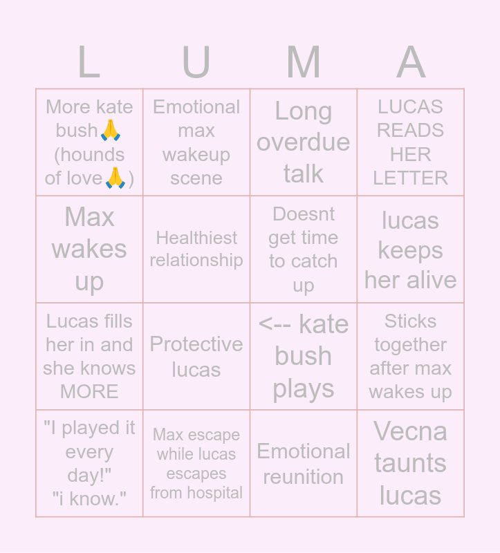 This bingo card has 16 words: Max escape while lucas escapes from hospital, Sticks together after max wakes up, Long overdue talk, More kate bush🙏 (hounds of love🙏), Lucas fills her in and she knows MORE, Emotional max wakeup scene, <-- kate bush plays, Emotional reunition, Max wakes up, Healthiest relationship, "I played it every day!" "i know.", LUCAS READS HER LETTER, Protective lucas, lucas keeps her alive, Doesnt get time to catch up and Vecna taunts lucas.