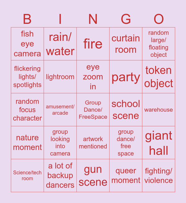 This bingo card has a free space and 36 words: man in desolate area, cars or bikes, large vehicles, lightroom, group dance/ free space, nature moment, eye zoom in, stairs, random large/ floating object, city/ rooftop, amusement/ arcade, curtain room, man in suit, school scene, token object, fish eye camera, motionless people in da back, group looking into camera, fighting/ violence, fire, warehouse, giant hall, a lot of backup dancers, Science/tech room, gun scene, rain/ water, random focus character, police, party, flickering lights/ spotlights, something is breaking, blood, queer moment, artwork mentioned, thunder and animals.