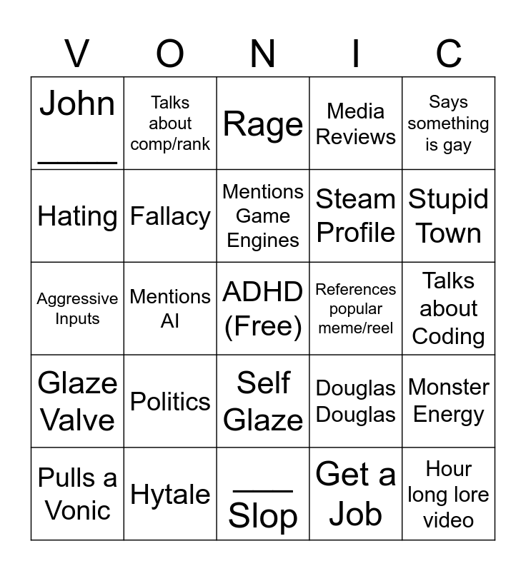 This bingo card has a free space and 24 words: Politics, Hytale, Mentions Game Engines, Pulls a Vonic, Says something is gay, John ____, Hating, Talks about comp/rank, References popular meme/reel, Self Glaze, Steam Profile, Aggressive Inputs, Douglas Douglas, Monster Energy, Fallacy, Get a Job, Talks about Coding, Rage, Stupid Town, Mentions AI, Hour long lore video, Glaze Valve, Media Reviews and ___ Slop.