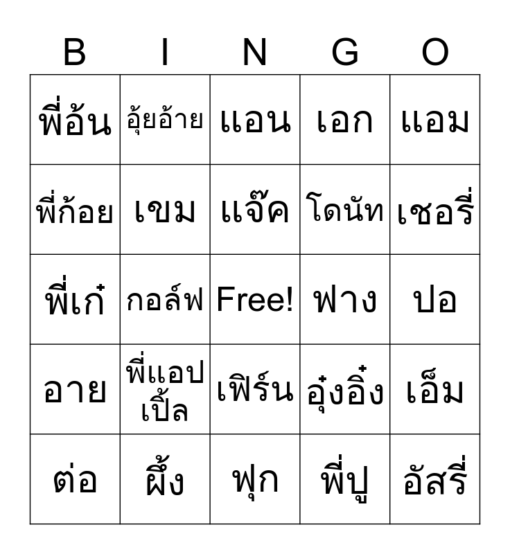 This bingo card has a free space and 34 words: พี่อุ๋ย, พี่ปู, วัน, แบงค์, อาย, เขม, แอม, ต่อ, อุ้ยอ้าย, กิ๊ก, แจ๊ค, แอน, พี่เกศ, พี่เหน่ง, ฟาง, เชอรี่, ผึ้ง, พี่เก๋, พี่แอปเปิ้ล, อุ๋งอิ๋ง, เฟิร์น, อัฐ, พี่อ้น, ปอ, ฟุก, อัสรี่, เอก, กระต่าย, โดนัท, พี่ก้อย, พี่มารถ, กอล์ฟ, เอ็ม and ต๊อบ.