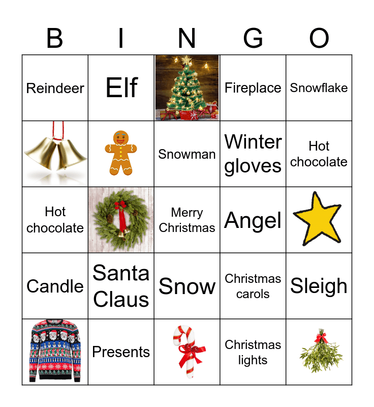 This bingo card has 8 images, a free space and 16 words: Santa Claus, Snowman, Christmas lights, Snowflake, Reindeer, Elf, Angel, Hot chocolate, Christmas carols, Sleigh, Presents, Fireplace, Hot chocolate, Candle, Snow and Winter gloves.