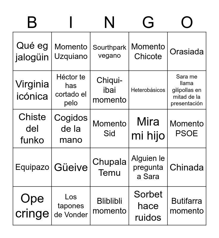 This bingo card has a free space and 24 words: Güeive, Los tapones de Vonder, Chiqui-ibai momento, Ope cringe, Orasiada, Qué eg jalogüin, Virginia icónica, Momento Uzquiano, Mira mi hijo, Chupala Temu, Heterobásicos, Chiste del funko, Alguien le pregunta a Sara, Chinada, Héctor te has cortado el pelo, Sorbet hace ruidos, Momento PSOE, Sourthpark vegano, Sara me llama gilipollas en mitad de la presentación, Cogidos de la mano, Butifarra momento, Equipazo, Momento Chicote and Bliblibli momento.