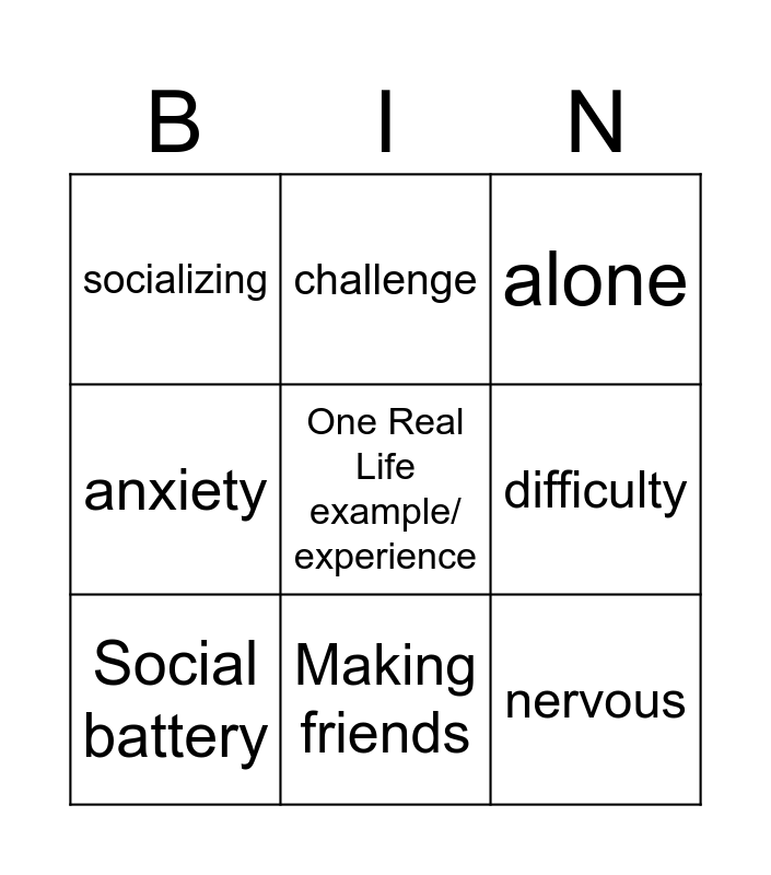 This bingo card has a free space and 8 words: difficulty, alone, challenge, Social battery, socializing, nervous, anxiety and Making friends.