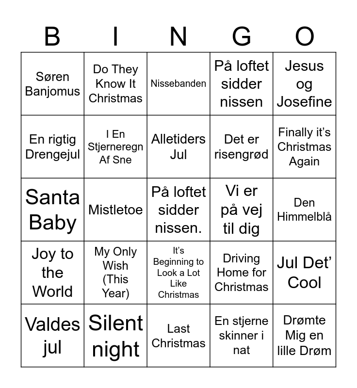 This bingo card has a free space and 58 words: Nu er det Jul, Silent night, O Holy Night, Joy to the World, En stjerne skinner i nat, En Stjerne Skinner I Nat, I En Stjerneregn Af Sne, Julehjertets hemmelighed, Det er risengrød, Det Er Risengrød, På loftet sidder nissen, Der bor en lille nissemand, Tinka, Tinka og kongespillet, Søren Banjomus, Søren Banjomus, Drømte Mig en lille Drøm, Jesus og Josefine, Lille Store Verden, Alletiders Jul, Vi er på vej til dig, Nissebanden, Valdes jul, Jul Det’ Cool, Jul i Angora, Den Himmelblå, Vintermiraklet, Endelig Jul Igen, Finally it’s Christmas Again, Guld Jul, Skal Vi Klippe Vores Julehjerter Sammen, Juletræet med sin pynt, Højt fra træets grønne top, Kender du den om Rudolf, Rudolph The Red-Nosed Reindeer, Snowman, Feliz Navidad, Mistletoe, Santa Baby, All I Want for Christmas, My Only Wish (This Year), Let it Snow! Let it Snow!, Driving Home for Christmas, Merry Christmas Everyone, Thank God It’s Christmas, Thank god it’s Christmas, Happy Xmas (War Is Over), It’s Beginning to Look a Lot Like Christmas, Last Christmas, Let Love Be Love, Shake Up Christmas, Rockin' Around The Christmas Tree, Jingle Bell Rock, The Christmas Song, Do They Know It Christmas, It’s Hard to Be a Nissemann, En rigtig Drengejul and The Støvle Dance.