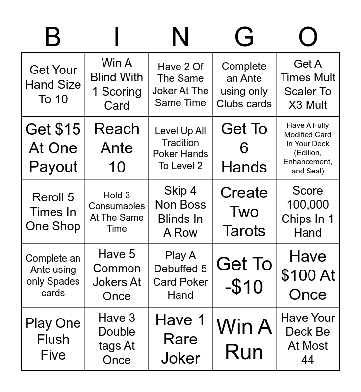 This bingo card has 25 words: Have 5 Common Jokers At Once, Have 1 Rare Joker, Level Up All Tradition Poker Hands To Level 2, Play One Flush Five, Get A Times Mult Scaler To X3 Mult, Get Your Hand Size To 10, Get $15 At One Payout, Win A Blind With 1 Scoring Card, Create Two Tarots, Play A Debuffed 5 Card Poker Hand, Get To 6 Hands, Reroll 5 Times In One Shop, Get To -$10, Have $100 At Once, Reach Ante 10, Have Your Deck Be At Most 44, Score 100,000 Chips In 1 Hand, Have 2 Of The Same Joker At The Same Time, Have A Fully Modified Card In Your Deck (Edition, Enhancement, and Seal), Hold 3 Consumables At The Same Time, Skip 4 Non Boss Blinds In A Row, Have 3 Double tags At Once, Complete an Ante using only Spades cards, Complete an Ante using only Clubs cards and Win A Run.