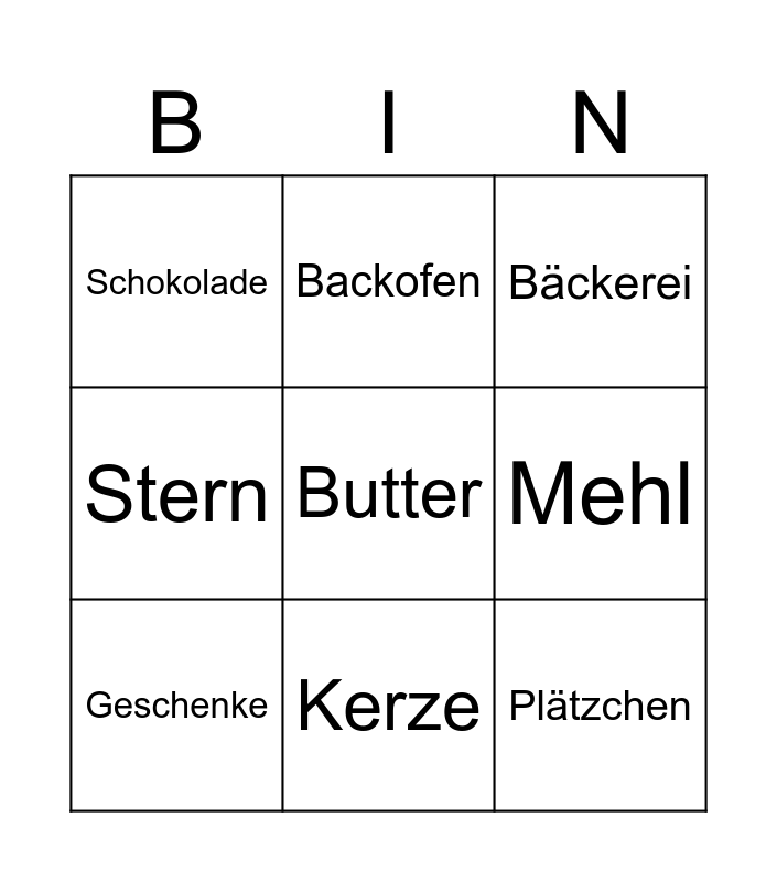This bingo card has 16 words: Free!, Weihnachten, Bäckerei, Schokolade, Plätzchen, Backofen, Rezept, Eier, Butter, Mehl, Tannenbaum, Stern, Schneemann, Kerze, Geschenke and Vanille.