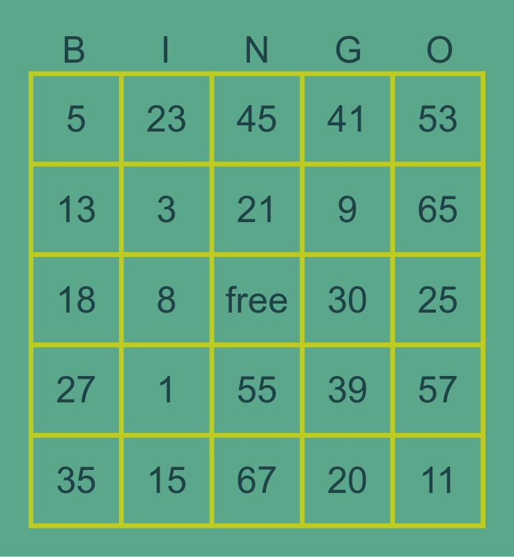 This bingo card has a free space and 24 words: 1, 15, 21, 35, 53, 5, 13, 23, 30, 55, 9, 18, 39, 57, 3, 20, 25, 45, 65, 8, 11, 27, 41 and 67.