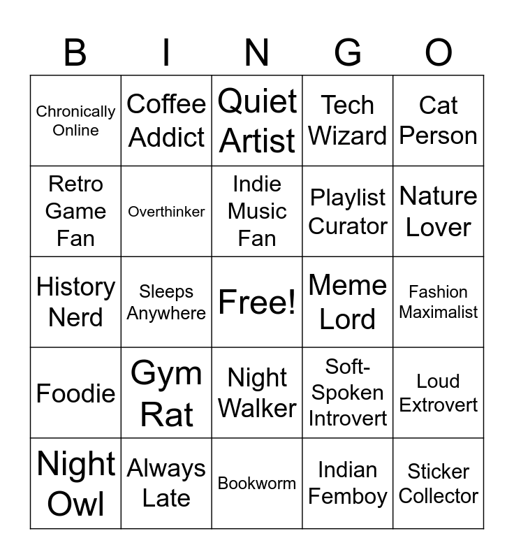 This bingo card has a free space and 24 words: Night Owl, Gym Rat, Indie Music Fan, Indian Femboy, Cat Person, Chronically Online, Coffee Addict, Quiet Artist, Meme Lord, Fashion Maximalist, History Nerd, Overthinker, Soft-Spoken Introvert, Loud Extrovert, Retro Game Fan, Always Late, Bookworm, Tech Wizard, Nature Lover, Foodie, Sleeps Anywhere, Night Walker, Playlist Curator and Sticker Collector.