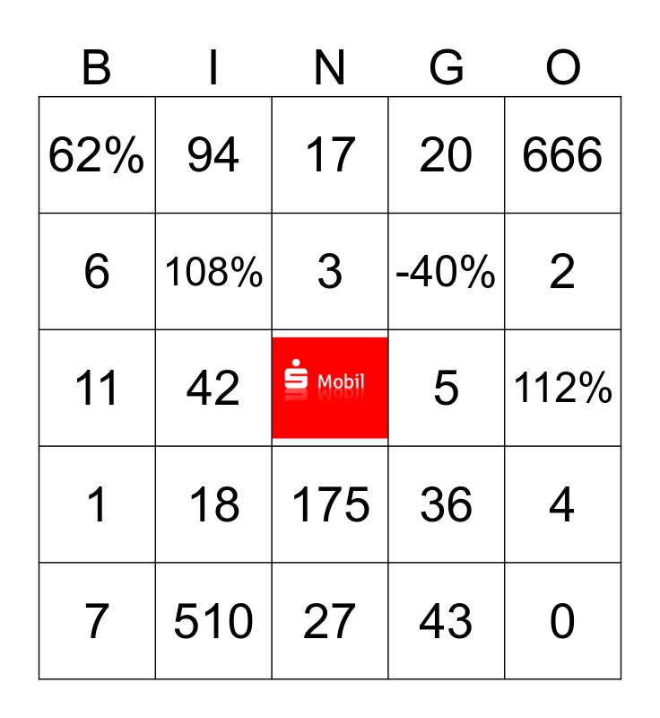 This bingo card has a free space and 24 words: 18, 510, 3, 7, 666, 62%, 6, 94, 5, 175, -40%, 11, 36, 4, 108%, 43, 112%, 17, 2, 42, 0, 1, 20 and 27.