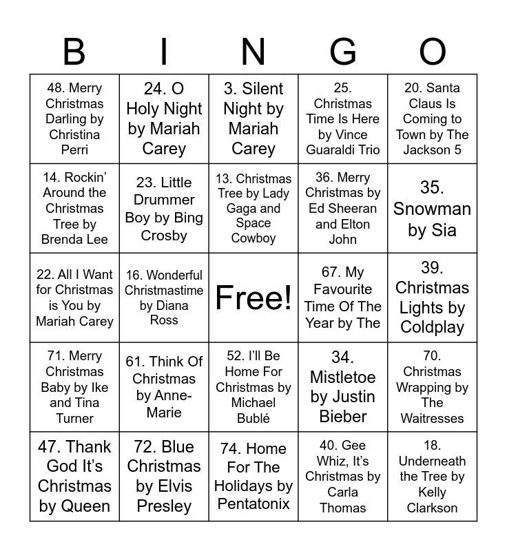 This bingo card has a free space and 76 words: 1. Jingle Bells by Mickey and the Gang, 2. Rudolph the Red-Nosed Reindeer by Gene Autry, 3. Silent Night by Mariah Carey, 4. Deck the Halls by Nat King Cole, 5. Frosty the Snowman by Ella Fitzgerald, 6. The 12 Days of Christmas by Straight No Chaser, 7. Jingle Bell Rock by Bobby Helms, 8. Feliz Navidad by José Feliciano, 9. O Tannenbaum by Nat King Cole, 10. Have a Holly Jolly Christmas by MercyMe, 11. It’s Beginning to Look a Lot Like Christmas, 12. Run Rudolph Run by Chuck Berry, 13. Christmas Tree by Lady Gaga and Space Cowboy, 14. Rockin’ Around the Christmas Tree by Brenda Lee, 15. Sleigh Ride by The Honey Sweets, 16. Wonderful Christmastime by Diana Ross, 17. Let It Snow, Let It Snow! by Frank Sinatra, 18. Underneath the Tree by Kelly Clarkson, 19. Here Comes Santa Claus by Mickey Mouse, 20. Santa Claus Is Coming to Town by The Jackson 5, 21. White Christmas by The Drifters, 22. All I Want for Christmas is You by Mariah Carey, 23. Little Drummer Boy by Bing Crosby, 24. O Holy Night by Mariah Carey, 25. Christmas Time Is Here by Vince Guaraldi Trio, 26. We Wish You a Merry Christmas by Love to Sing, 27. The First Noel by The Countdown Kids, 28. It’s the Most Wonderful Time of the Year, 29. I Want a Hippopotamus for Christmas, 30. The Chipmunk Song (Christmas Don’t Be Late), 31. Grandma Got Run Over by a Reindeer, 32. Have Yourself a Merry Little Christmas, 33. The Christmas Song by Nat King Cole, 34. Mistletoe by Justin Bieber, 35. Snowman by Sia, 36. Merry Christmas by Ed Sheeran and Elton John, 37. Baby, it’s Cold Outside, 38. Santa, Can’t You Hear Me by Kelly Clarkson, 39. Christmas Lights by Coldplay, 40. Gee Whiz, It’s Christmas by Carla Thomas, 41. Please Come Home For Christmas by Eagles, 42. Happy Xmas by John Lennon, 43. Santa Tell Me by Ariana Grande, 44. Santa’s Coming For Us by Sia, 45. The Christmas Sweater by Michael Bublé, 46. Winter Wonderland by Blake Shelton, 47. Thank God It’s Christmas by Queen, 48. Merry Christmas Darling by Christina Perri, 49. Step Into Christmas by Elton John, 50. Under the Mistletoe by Brett Eldredge, 51. Somewhere Only We Know by Lily Allen, 52. I’ll Be Home For Christmas by Michael Bublé, 53. Must be Santa by Kidz Bop Kids, 54. Christmas Wish by Percy Sledge, 55. A Winter’s Tale by David Essex, 56. 2000 Miles by Pretenders, 57. The Power of Love by Gabriele Aplin, 58. When a Child Is Born bt Cliff Richard, 59. Christmas Isn’t Canceled by Kelly Clarkson, 60. It Will Still Be Christmas, 61. Think Of Christmas by Anne-Marie, 62. Christmas Saves the Year by Twenty One Pilots, 63. One More Sleep by Leona Lewis, 64. Presents For Christmas by Solomon Burke, 65. Christmas Always Finds Me by Ingrid Andress, 66. Little Drummer Boy by Kenny Rogers, 67. My Favourite Time Of The Year by The, FlorinStreet Band, 68. Carol for the Bells, 69. Christmas (Baby Please Come Home), 70. Christmas Wrapping by The Waitresses, 71. Merry Christmas Baby by Ike and Tina Turner, 72. Blue Christmas by Elvis Presley, 73. Christmas Tree Farm by Taylor Swift, 74. Home For The Holidays by Pentatonix and 75. My Only Wish (This Year) by Britney Spears.