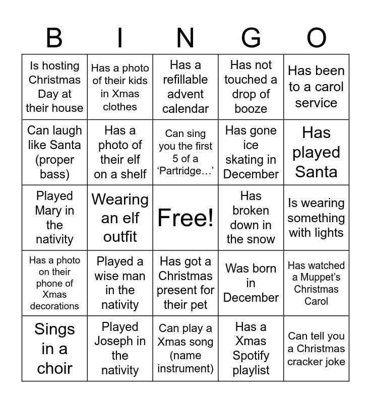 This bingo card has a free space and 33 words: Wearing a Christmas jumper, Wearing Christmas socks, Wearing an elf outfit, Has a photo on their phone of a Xmas tree., Has a photo on their phone of Xmas decorations, Has a photo of their elf on a shelf, Has been to a carol service, Sings in a choir, Has a photo of their kids in Xmas clothes, Can sing you the chorus of ‘Last Christmas’, Can sing you the first 5 of a ‘Partridge…’, Has a refillable advent calendar, Has a giftcard on them., Has baked a Christmas cake, Has broken down in the snow, Has played Santa, Played Joseph in the nativity, Played Mary in the nativity, Played a wise man in the nativity, Was born in December, Has got a Christmas present for their pet, Has once made their own wreath, Is hosting Christmas Day at their house, Is wearing something with lights, Can play a Xmas song (name instrument), Can tell you a Christmas cracker joke, Has not touched a drop of booze, Has gone ice skating in December, Can laugh like Santa (proper bass), Has watched a Muppet’s Christmas Carol, Can say Happy Christmas in another language, Has a Xmas Spotify playlist and Was involved in Secret Santa.