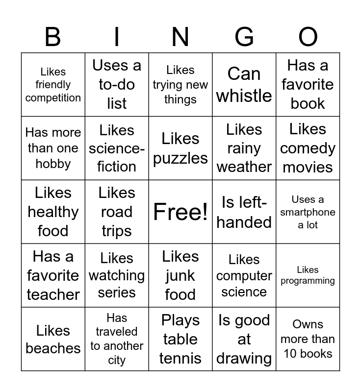 This bingo card has a free space and 250 words: Has a pet, Has a dog, Has a cat, Has more than one pet, Likes animals, Is an only child, Has siblings, Has an older sibling, Has a younger sibling, Lives with grandparents, Likes reading books, Reads every day, Has a favorite author, Likes fiction, Likes non-fiction, Likes comics or manga, Likes poetry, Owns more than 10 books, Has visited a library recently, Has a favorite book, Likes math, Likes physics, Likes chemistry, Likes biology, Likes computer science, Likes history, Likes geography, Likes economics, Likes political science, Likes psychology, Is good at math, Is good at science, Is good at writing, Is good at drawing, Is good at problem solving, Is good at memorization, Is good at public speaking, Is good at presentations, Is good at debates, Is good at teamwork, Plays a sport, Plays football, Plays cricket, Plays badminton, Plays basketball, Plays table tennis, Plays volleyball, Plays tennis, Plays chess, Plays an outdoor game, Likes indoor games, Likes board games, Likes card games, Likes puzzles, Likes riddles, Likes Sudoku, Likes crosswords, Likes logic games, Likes strategy games, Likes brain teasers, Plays video games, Plays mobile games, Plays PC games, Likes multiplayer games, Likes single-player games, Likes adventure games, Likes action games, Likes puzzle games, Likes simulation games, Likes esports, Can swim, Can ride a bicycle, Can whistle, Can snap fingers, Can do a cartwheel, Can juggle, Can skip rope, Can solve a Rubik’s cube, Can do mental math, Can type fast, Likes music, Listens to music daily, Likes pop music, Likes classical music, Likes instrumental music, Likes movie soundtracks, Likes lo-fi music, Likes rock music, Likes hip-hop, Likes indie music, Plays a musical instrument, Plays guitar, Plays piano, Plays keyboard, Plays drums, Plays violin, Sings well, Likes singing, Has performed on stage, Has attended a concert, Likes movies, Likes watching series, Likes documentaries, Likes animated movies, Likes action movies, Likes comedy movies, Likes mystery movies, Likes science-fiction, Likes fantasy movies, Likes thrillers, Likes drawing, Likes painting, Likes sketching, Likes digital art, Likes photography, Likes graphic design, Likes calligraphy, Likes crafts, Likes DIY projects, Likes origami, Likes programming, Knows Java, Knows Python, Knows C or C++, Knows HTML, Has written a program, Has made a project, Likes debugging, Likes algorithms, Likes logical thinking, Uses a laptop daily, Uses a desktop computer, Uses a tablet, Uses a smartphone a lot, Uses the internet daily, Uses YouTube often, Uses social media, Uses email, Uses online learning platforms, Likes tech gadgets, Likes food, Likes street food, Likes homemade food, Likes spicy food, Likes sweet food, Likes fast food, Likes snacks, Likes chocolate, Likes ice cream, Likes fruits, Can cook, Has helped cook at home, Likes baking, Has a favorite dish, Likes trying new food, Likes cooking shows, Knows a family recipe, Likes food experiments, Likes healthy food, Likes junk food, Likes traveling, Has traveled to another city, Has traveled by train, Has traveled by airplane, Likes road trips, Likes mountains, Likes beaches, Likes nature, Likes sightseeing, Likes photography while traveling, Is an early riser, Is a night owl, Sleeps more than 7 hours, Likes naps, Likes mornings, Likes evenings, Likes rainy weather, Likes sunny weather, Likes cold weather, Likes warm weather, Wears glasses, Has braces, Is left-handed, Is right-handed, Has a nickname, Has changed schools, Has a favorite teacher, Has a favorite subject, Likes school activities, Likes group work, Has participated in a competition, Has won a prize, Has received a certificate, Has given a speech, Has hosted an event, Has volunteered, Has helped organize something, Likes leadership roles, Likes helping others, Likes teamwork, Likes science experiments, Likes lab work, Likes solving equations, Likes graphs and charts, Likes measurements, Likes practical work, Likes theory questions, Likes numerical problems, Likes reasoning questions, Likes challenges, Keeps a diary, Likes journaling, Likes planning, Uses a to-do list, Likes schedules, Likes organizing things, Likes neat notes, Likes color-coding, Likes stationery, Likes notebooks, Likes learning new skills, Likes self-improvement, Likes watching tutorials, Likes educational videos, Likes quizzes, Likes competitions, Likes puzzles under time pressure, Likes brain challenges, Likes trying new things, Likes exploring ideas, Has a hobby, Has more than one hobby, Practices a hobby weekly, Likes creative hobbies, Likes technical hobbies, Likes outdoor hobbies, Likes indoor hobbies, Likes solo hobbies, Likes group hobbies, Likes learning from hobbies, Likes goals, Likes achievements, Likes progress tracking, Likes challenges with friends, Likes friendly competition, Likes team games, Likes individual tasks, Likes brainstorming, Likes problem discussions and Likes asking questions.