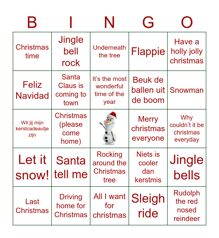 This bingo card has a free space and 27 words: Niets is cooler dan kerstmis, O denneboom, Beuk de ballen uit de boom, All I want for christmas, Feliz Navidad, Underneath the tree, Jingle bell rock, Let it snow!, Merry christmas everyone, Jingle bells, Wil jij mijn kerstcadeautje zijn, Flappie, Last Christmas, Driving home for Christmas, Snowman, It’s beginning to look a lot like christmas, Santa Claus is coming to town, It’s the most wonderful time of the year, Santa tell me, Christmas time, Why couldn’t it be christmas everyday, Sleigh ride, Christmas (please come home), Rudolph the red nosed reindeer, Rocking around the Christmas tree, Have a holly jolly christmas and Kerstezel.