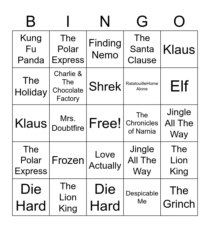 This bingo card has a free space and 47 words: Home Alone, The Grinch, Elf, Die Hard, Frozen, Love Actually, The Polar Express, Harry Potter, The Holiday, A Christmas Carol, Charlie & The Chocolate Factory, The Santa Clause, The Lion King, Jingle All The Way, The Muppet Christmas Carol, Paddington, Shrek, The Chronicles of Narnia, Finding Nemo, Klaus, Mrs. Doubtfire, Despicable Me, Kung Fu Panda, RatatouilleHome Alone, The Grinch, Elf, Die Hard, Frozen, Love Actually, The Polar Express, Harry Potter, The Holiday, A Christmas Carol, Charlie & The Chocolate Factory, The Santa Clause, The Lion King, Jingle All The Way, The Muppet Christmas Carol, Paddington, Shrek, The Chronicles of Narnia, Finding Nemo, Klaus, Mrs. Doubtfire, Despicable Me, Kung Fu Panda and Ratatouille.