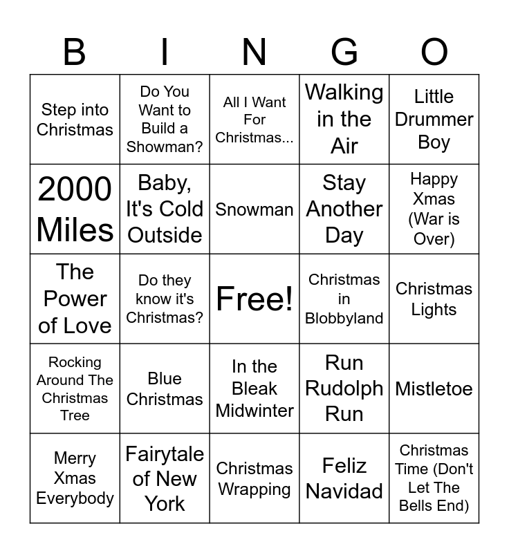This bingo card has a free space and 29 words: Merry Xmas Everybody, I Wish It Could Be Christmas Everyday, Do they know it's Christmas?, Last Christmas, Step into Christmas, All I Want For Christmas..., Baby, It's Cold Outside, Blue Christmas, Christmas in Blobbyland, Fairytale of New York, Christmas Lights, Christmas Time (Don't Let The Bells End), Christmas Wrapping, Feliz Navidad, Happy Xmas (War is Over), I Saw Mommy Kissing Santa Claus, In the Bleak Midwinter, Rocking Around The Christmas Tree, Little Drummer Boy, The Power of Love, Run Rudolph Run, Santa Baby, Stay Another Day, 2000 Miles, Walking in the Air, Do You Want to Build a Showman?, Mistletoe, Snowman and Santa's Coming for us.