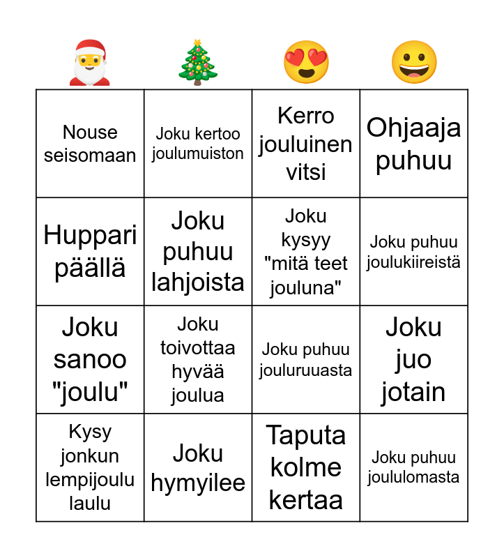 This bingo card has 16 words: Joku hymyilee, Joku juo jotain, Kerro jouluinen vitsi, Nouse seisomaan, Joku sanoo "joulu", Joku kertoo joulumuiston, Joku puhuu jouluruuasta, Taputa kolme kertaa, Huppari päällä, Joku puhuu lahjoista, Kysy jonkun lempijoulu laulu, Ohjaaja puhuu, Joku toivottaa hyvää joulua, Joku puhuu joulukiireistä, Joku kysyy "mitä teet jouluna" and Joku puhuu joululomasta.