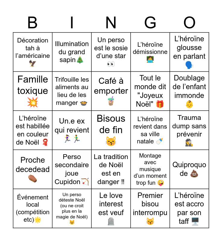 This bingo card has a free space and 24 words: Perso secondaire joue Cupidon🏹, Un perso déteste Noël (ou ne croit plus en la magie de Noël) 😾, Café à emporter🧋, Événement local (compétition etc)🌟, L’héroïne glousse en parlant 🗣️, Décoration tah à l’américaine🦅, Famille toxique 💥, Illumination du grand sapin🎄, L’héroïne revient dans sa ville natale 🍼, La tradition de Noël est en danger ‼️, Tout le monde dit "Joyeux Noël" 🎁, L’héroïne est habillée en couleur de Noël 🧣, Montage avec musique d’un moment trop fun 🤪, Quiproquo de 💩, Trifouille les aliments au lieu de les manger 🍲, Premier bisou interrompu 😽, Trauma dump sans prévenir 🕵️♀️, Un perso est le sosie d’une star👀, Doublage de l’enfant immonde 👶, Un.e ex qui revient 🏃♀️🏃♂️, L’héroïne est accro par son taff 🖥️, Proche decedead ⚰️, L’héroïne démissionne 👩💻 and Le love interest est veuf 🪦.