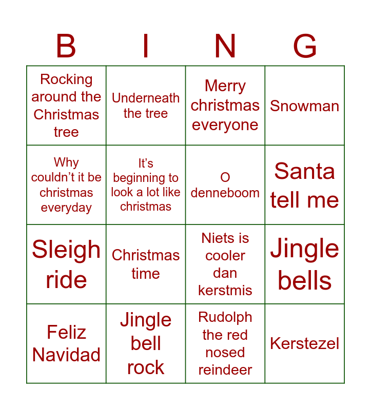 This bingo card has 27 words: Santa Claus is coming to town, Beuk de ballen uit de boom, Sleigh ride, Flappie, It’s beginning to look a lot like christmas, Merry christmas everyone, Underneath the tree, Kerstezel, Jingle bell rock, All I want for christmas, Niets is cooler dan kerstmis, Snowman, Wil jij mijn kerstcadeautje zijn, Have a holly jolly christmas, Christmas time, Driving home for Christmas, O denneboom, Santa tell me, Let it snow!, Rocking around the Christmas tree, Rudolph the red nosed reindeer, Christmas (please come home), Jingle bells, Feliz Navidad, It’s the most wonderful time of the year, Why couldn’t it be christmas everyday and Last Christmas.