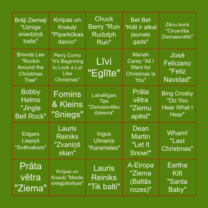 This bingo card has 25 words: Lauris Reiniks "Zvaniņš skan", Lauris Reiniks "Tik balti", Līvi "Eglīte", Prāta vētra "Ziema", Zēnu koris "Circenīša Ziemassvētki", Brāļi Ziemeļi "Uzniga sniedziņš balts", Brenda Lee "Rockin Around the Christmas Tree", Knīpas un Knauķi "Piparkūkas danco", Prāta vētra "Ziemu apēst", Ingus Ulmanis "Karameles", Mariah Carey "All I Want for Christmas Is You", Bobby Helms "Jingle Bell Rock", Dean Martin "Let It Snow!", Wham! "Last Christmas", Perry Como "It's Beginning to Look a Lot Like Christmas", Eartha Kitt "Santa Baby", Bing Crosby "Do You Hear What I Hear", Chuck Berry "Run Rudolph Run", José Feliciano "Feliz Navidad", Fomins & Kleins "Sniegs", Labvēlīgais Tips "Ziemassvētku dziesma", Knīpas un Knauķi "Mazās sniegpārsliņas", Edgars Liepiņš "Svētvakars", Bet Bet "Klāt ir atkal jaunais gads" and A-Eiropa "Ziema (Baltās rozes)".