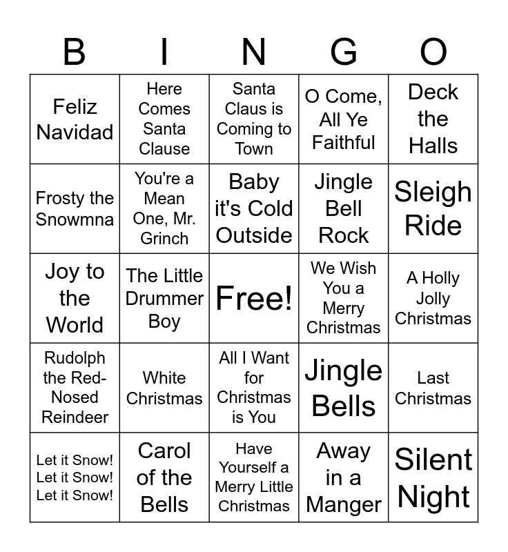 This bingo card has a free space and 26 words: All I Want for Christmas is You, Away in a Manger, Baby it's Cold Outside, Carol of the Bells, Deck the Halls, Feliz Navidad, Frosty the Snowmna, Here Comes Santa Clause, A Holly Jolly Christmas, Jingle Bells, Jingle Bell Rock, Joy to the World, Last Christmas, Let it Snow! Let it Snow! Let it Snow!, The Little Drummer Boy, O Christmas Tree, O Come, All Ye Faithful, Rudolph the Red-Nosed Reindeer, Santa Claus is Coming to Town, Silent Night, Sleigh Ride, Have Yourself a Merry Little Christmas, We Wish You a Merry Christmas, White Christmas, You're a Mean One, Mr. Grinch and The 12 Days of Christmas.