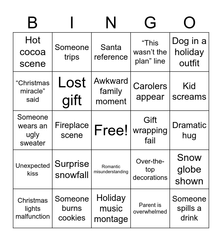 This bingo card has a free space and 24 words: Surprise snowfall, Someone burns cookies, Awkward family moment, Christmas lights malfunction, Dog in a holiday outfit, Hot cocoa scene, “Christmas miracle” said, Someone trips, Gift wrapping fail, Romantic misunderstanding, Carolers appear, Someone wears an ugly sweater, Over-the-top decorations, Snow globe shown, Lost gift, Parent is overwhelmed, Dramatic hug, Santa reference, Kid screams, Fireplace scene, Someone spills a drink, Unexpected kiss, “This wasn’t the plan” line and Holiday music montage.