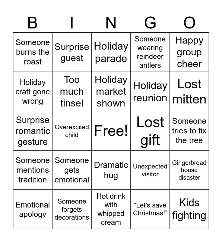 This bingo card has a free space and 192 words: Surprise snowfall, Someone burns cookies, Awkward family moment, Christmas lights malfunction, Dog in a holiday outfit, Hot cocoa scene, “Christmas miracle” said, Someone trips, Gift wrapping fail, Romantic misunderstanding, Carolers appear, Someone wears an ugly sweater, Over-the-top decorations, Snow globe shown, Lost gift, Parent is overwhelmed, Dramatic hug, Santa reference, Kid screams, Fireplace scene, Someone spills a drink, Unexpected kiss, “This wasn’t the plan” line, Holiday music montage, Gingerbread house disaster, Someone cries, Car breaks down, Hints of romance, Slow-motion moment, Reindeer reference, Snowball fight, Someone rushes to the airport, Ornament breaks, Gift exchange scene, Hot drink cheers, Jingle bells sound, Cat knocks something over, Christmas shopping chaos, Mistletoe appears, A character apologizes, Too many decorations, Someone gets lost, Holiday feast scene, A sudden argument, Child asks deep question, “Let’s save Christmas!”, Someone sings off-key, Neighbor complaint, Character forgets a gift, Snowman shown, Someone burns the roast, Dramatic phone call, Hug in the cold, Sappy holiday speech, Elf costume appears, Someone slips on ice, “I hate Christmas” moment, Carols in the background, Last-minute shopping, Romantic tension, Tree falls over, A pet steals food, Character shows old photo, Someone knocks on the door unexpectedly, Matching pajamas, Glitter everywhere, Misdelivered package, Surprise guest, Hot cider scene, Someone mentions tradition, Power outage, Happy tears, Someone drinks eggnog, A character panics, Holiday lights switch-on, Someone bakes badly, Lost mitten, Santa sighting, Tragic backstory revealed, An adult acts like a child, Gift too big to wrap, Someone proposes a toast, Mistletoe avoidance, Loud caroling, Unnecessary dramatic pause, “You don’t understand!”, Snowstorm causes chaos, Someone falls asleep on the couch, Family tradition argument, Character makes a promise, Kids fighting, Overpacked suitcase, Christmas card shown, Forgotten appointment, Fireplace mishap, Happy ending hint, Candy cane appears, Pet escapes, Someone ruins a surprise, Holiday craft gone wrong, Someone overdressed for winter, Choir singing, Car gets stuck, Unexpected visitor, Romantic snowfall scene, Kitchen disaster, “We can fix this!”, Someone overreacts, Christmas sweater competition, Someone gives unwanted advice, Broken decoration, Family photo attempt, Holiday parade, Lost phone, Someone brings too many presents, Dramatic confession, Wrong name on gift tag, Someone eats too much, Fireplace stockings shown, Happy group cheer, Someone late to event, Oversized Christmas tree, Someone slips while carrying gifts, Hot drink spill, Baby cries, Someone mentions Santa’s list, Gift exchange is awkward, Unexpected snowstorm, Romantic eye contact, Someone plays holiday music too loud, Candle blows out, Someone forgets decorations, Pet in wrapping paper, A neighbor helps, “Best Christmas ever!”, Someone sneaks food, Lost wallet, Too much tinsel, Tree lighting ceremony, Someone wearing reindeer antlers, A character dramatically storms out, Someone hugs a stranger, Holiday cookie eating contest, Warm reconciliation, Someone is overly cheerful, Accidental insult, Cookie tray collapse, Children singing, Tree topper falls, Wrong gift opened, Spilled wine, Someone gets emotional, Lost luggage, Someone receives unexpected message, Christmas karaoke, Someone wears pajamas in public, Hot drink with whipped cream, Snow angel scene, Character admits a secret, Someone runs late, Holiday market shown, Someone mishears something, Family member arrives early, Surprise romantic gesture, Someone loses patience, Someone giggles uncontrollably, Gift opens itself accidentally, Happy squeal, Miscommunication leads to chaos, Someone sneaks a present, A character is cold, Someone burns their tongue, Festive scarf appearance, Someone drinks too fast, A loud knock on the door, Reindeer decoration shown, Emotional apology, Someone mentions childhood memory, Hot cocoa with marshmallows, Someone refuses a gift, Christmas countdown shown, A random act of kindness, Falling snow in slow motion, Someone tries to fix the tree, Holiday reunion, Someone misplaces their keys, Overexcited child, Dramatic gasp, Someone spills food, Tree ornaments match clothing, Someone sighs loudly and Big group hug.